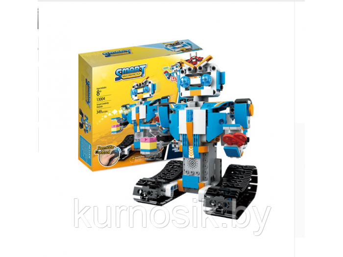 Реплика LEGO Boost – это робот с модулем управления. Он состоит из элементов белого, голубого, оранжевого, черного, серого, другого цвета. Средством передвижения механического воина MOULDKING выступает гусеничная лента. Она имеет прямоугольный радиус перемещения, что благотворно сказывается на скорости хода.