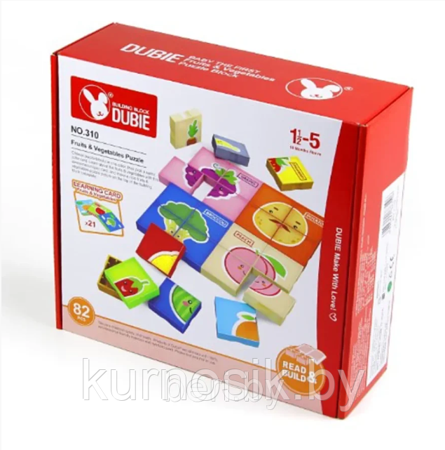 Игрушка-пазл 310 для самых маленьких. Ребенку предстоит сложить мини-пазлы из квадратных деталей, чтобы получить изображения различных фруктов и овощей. Всего в наборе 82 детали и 21 карточка.