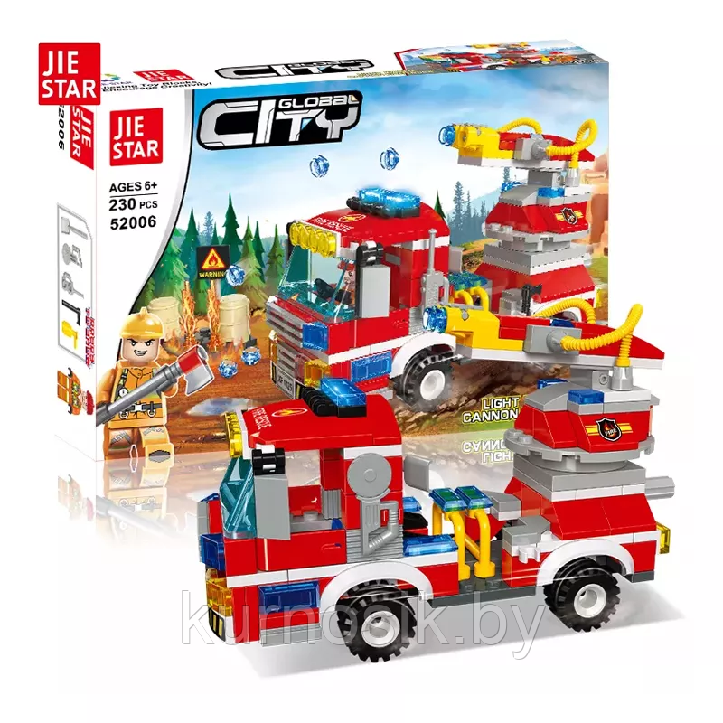 Конструктор Jiestar отличается яркими цветами. максимальной подгонкой блоков, изготовлен из прочного и качественного пластика. Детали пожарной машины тщательно проработаны - она имеет мигалку, насосы, бак для воды, шланги и башню с пушкой.