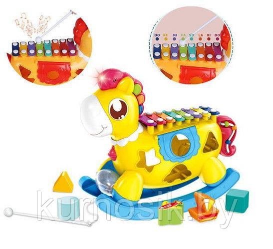 Развивающая игрушка Музыкальная лошадка сортер ксилофон, HE8024, которая очень понравится малышу, состоит из нескольких элементов: сортер, погремушка, металлофон и качалка. В комплект входят лошадка, фигурки-формочки и 3 карточки с нотами песен. На бочках лошадки сделаны отверстия, в них следует помещать фигурки-формочки, находя нужные по размеру и форме.