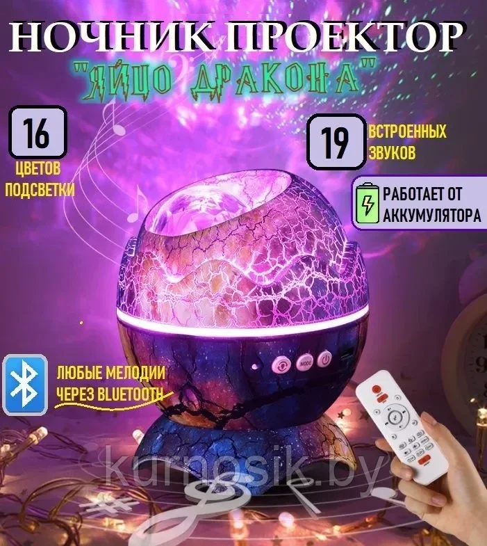 Ночник проектор звездного неба в виде яйца дракона , кто-то называет его яйцо динозавра- потрясающая новинка среди светильников. Это проектор волшебного космоса, , в тоже время музыкальная колонка с Bluetooth. Необычный, оригинальный дизайн способен привлечь как детей, так и взрослых. Этот проектор звездного неба является также и колонкой, проиграет ваши любимые треки, создавая светомузыку в ритм композиции или же позволит расслабиться под звуки природы, уже встроенные в светильник. Ночник детский может работать как портативный проектор и домашний планетарий, проецируя сияющие звезды на потолок и целые космические галактики с облаками туманностей. При необходимости, у планетария можно менять туманности, создавая свой собственный космос и ночное небо у себя дома. Отметим, что свечение звезд и туманностей мягкое, равномерное и безопасное для детского зрения. Ночник в детскую комнату имеет лампу, вращающуюся на 360 градусов. Проектор -ночник в детскую комнату станет незаменимым помощником для многих мам. Поставьте ночник для малышей в спальне на тумбочку и он прекрасно впишется в интерьер . Ночник воспроизводит все популярные звуки белого шума для детей, для их спокойного засыпания. Можно включить шум дождя, пение птиц, шум океана, треск костра. Можно слушать сказки на ночь, медитации с помощью bluetooth. Можно использовать ночник-светильник как ночную лампу, просто закрыв крышечку. Ночник будет работать столько, сколько потребуется и отключится по таймеру. Таймер выключения можно настроить на 1-2 часа. Лазерный светодиодный ночник проектор звездного неба оснащен пультом управления. Пультом управления можно менять режимы освещения, их яркость, треки, регулировать громкость, устанавливать таймер выключения. Ночник включается в розетку, работает от сети при помощи USB-кабеля.