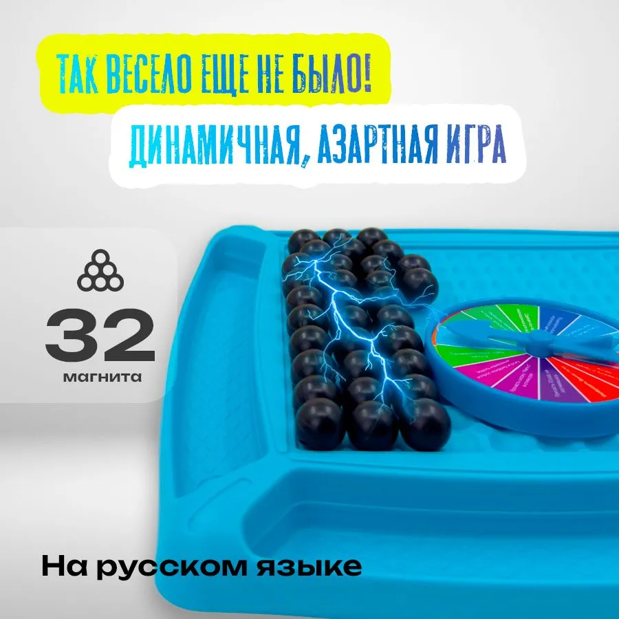 Комплектация 32 магнита в удобной упаковке, колесо смешных заданий на русском языке, игровое поле из твердого пластика.