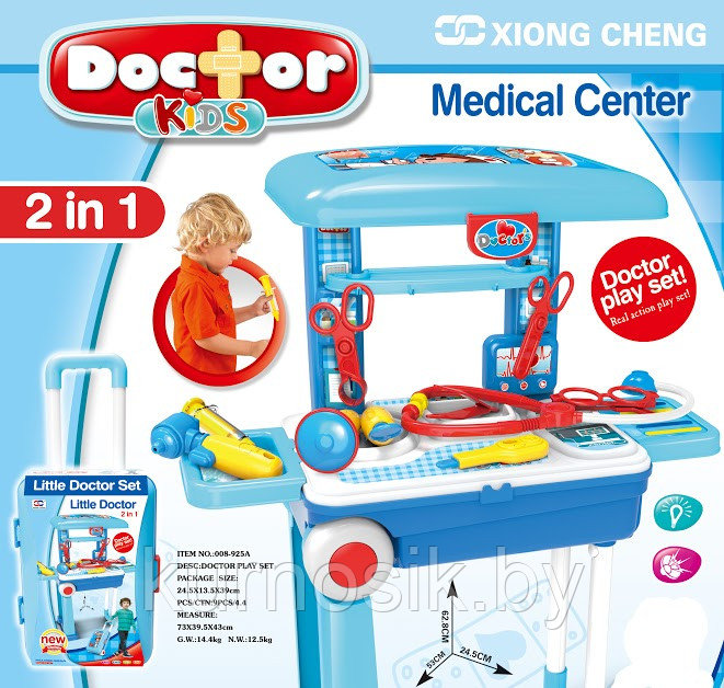 Игровой набор юного доктора "Мобильный медицинский центр" (Арт.008-925А) легко трансформируется из стационарной медицинской стойки в чемодан с длинной ручкой, его можно свободно и легко перемещать по комнате. Ребенок может обыграть ситуацию срочного вызова врача к пациенту, он может быстро собрать необходимые медицинские инструменты в чемодан и поспешить на помощь.